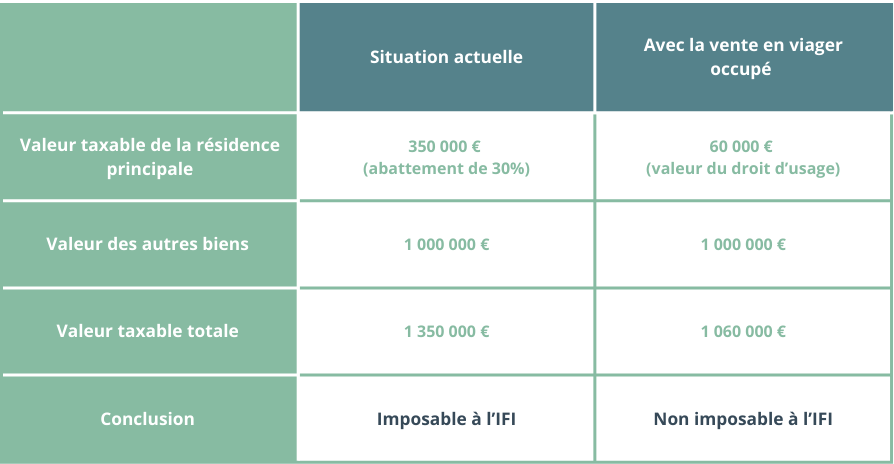 • Le viager occupé génère une sortie partielle du bien du patrimoine taxable. Il ne reste qu’une quote-part représentative de la valeur du droit d’usage qui est rentre dans la valeur taxable. Cependant, le vendeur est normalement assez âgé lors de la vente d’un bien en viager, en conséquence, la valeur du droit d’usage représente une part minime de la valeur vénale du bien.